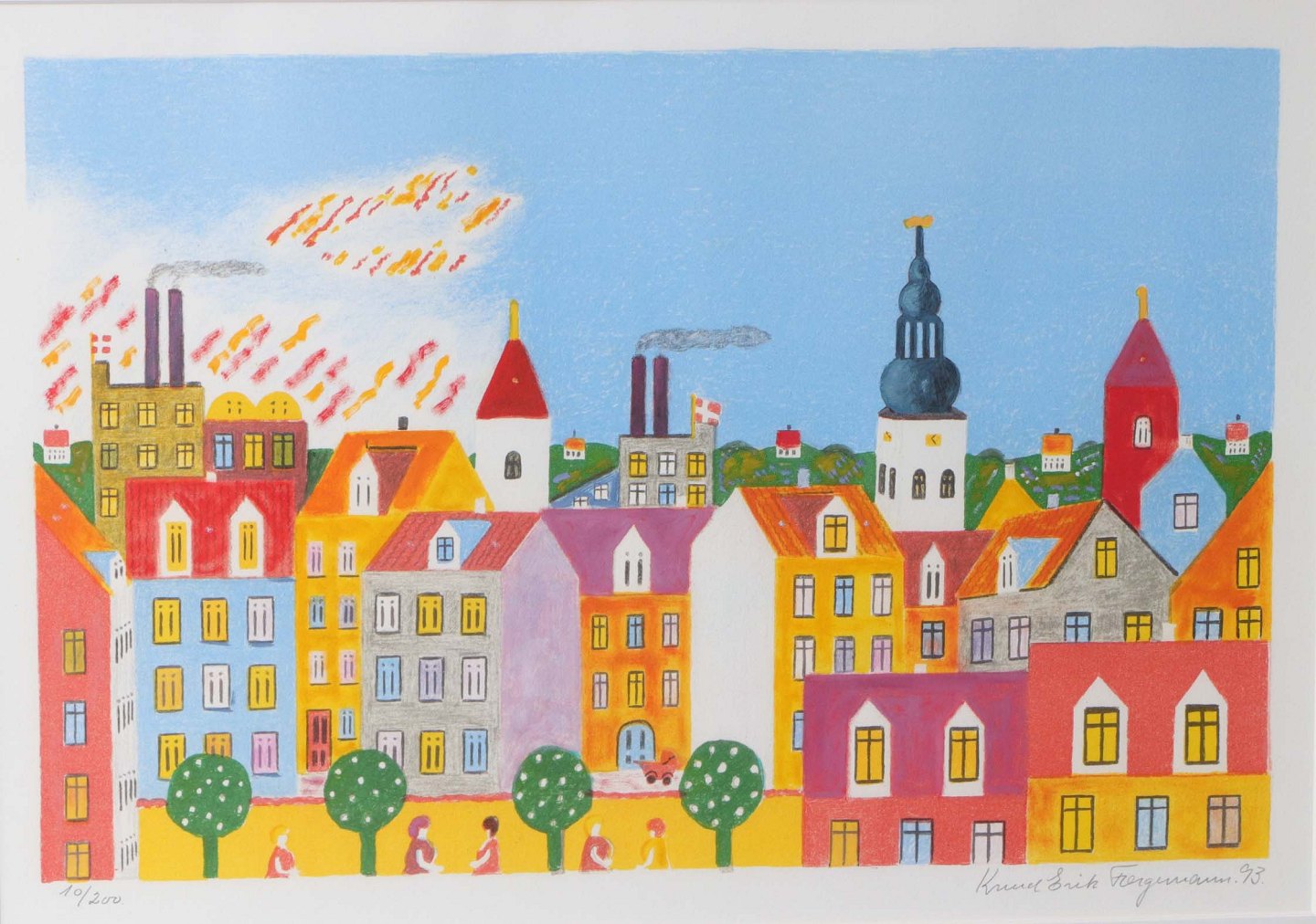 Text available in Danish: Indrammet litografi i passepartout med sølvmalet ramme. Litografisk tryk nr. 10/200 fra år 1993 med titlen Aalborg, hvor motivet viser et udsnit af byområdet udsigt til Budolfi kirke i baggrunden.