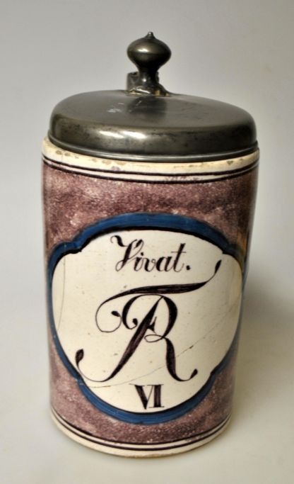 Hannoversch-Münden Faience Valse mug, 1808 - 1839. Germany. Front decorated with the text: Vivat Fr. WE. Decorated in manganese, black and blue. Pewter lid without decoration. Unsigned. The lid is indistinctly stamped. Height.: 15 cm.