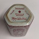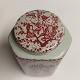 Trekantet tedåse med låg i fajance fra Nymølle fabrikken. Rødt dekoreret med en nøgen "Susanne, der bader" mændene betragter skønheden fra deres skjul. Designet af Bjørn Wiinblad. Fabriksmærket på bunden. H. 10 cm.