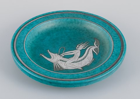 Green glaze decorated with a mermaid riding a fish in silver. Art Deco.