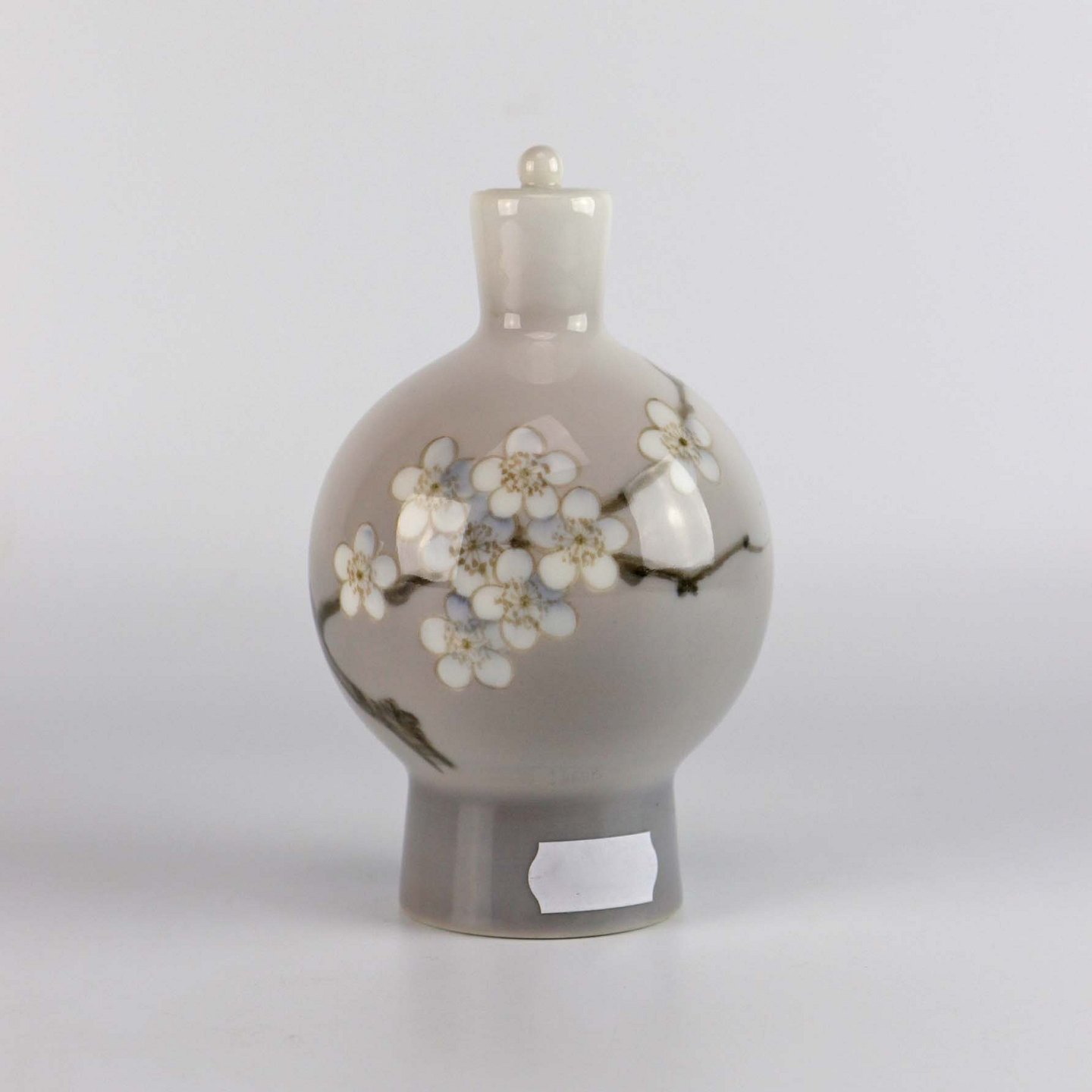 Rund vase og flakon i porcelæn med prop med motiv af blomster på grene nr 383