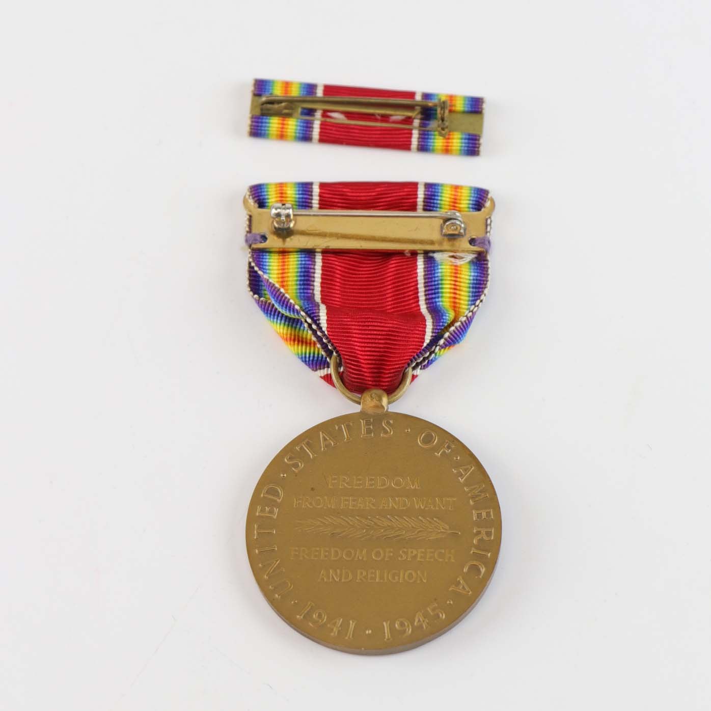 Text available in Danish: Amerikansk medalje fra 2. verdenskrig i to dele. Med teksten United States of America 1941-1945. World War II, Freedom from fear and want freedom of speech and religion