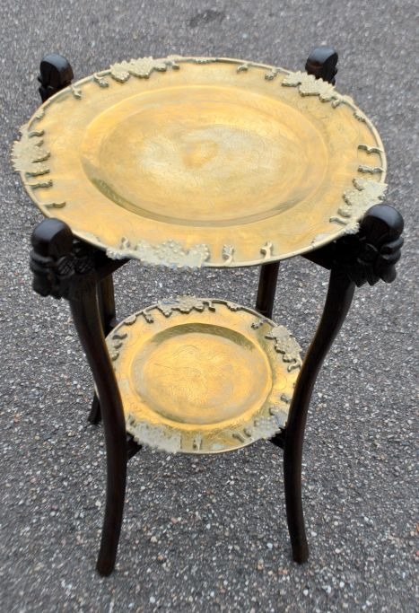 Chinese occasion table in wood with two metal dishes, 19th/20th century China. Both dishes engraved with dragons and rim decorated with vines and grapes. Table in dark wood with cutouts in the top. H: 57 cm. W: 41 cm. Large dish dia: 36 cm. Small dish dia: 25.5 cm.