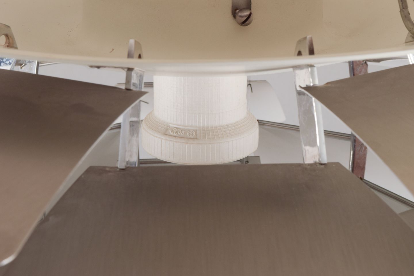 Upper shade in matte white metal, blades in brushed steel, suspension with integrated steel line. 72 blades.