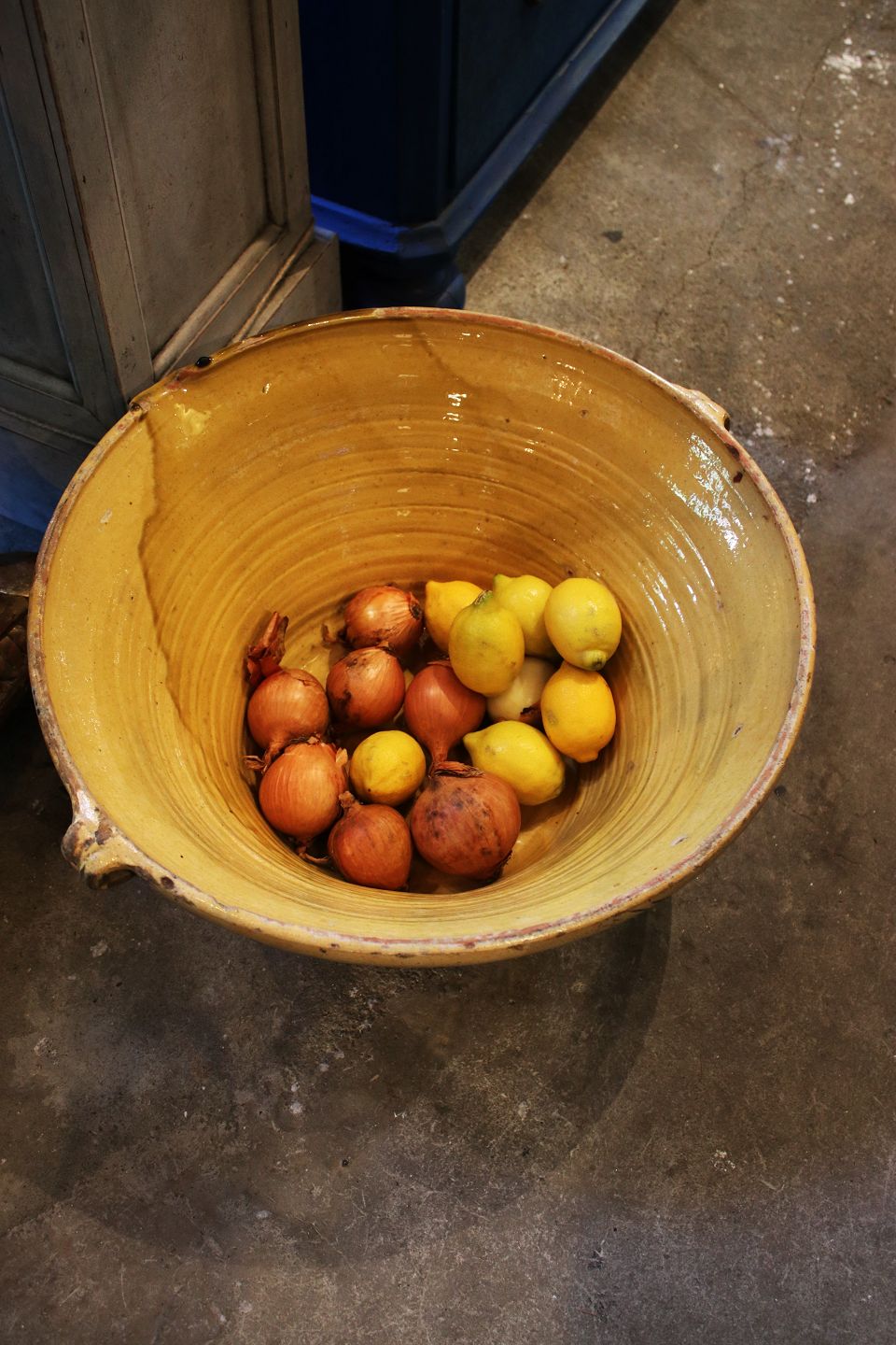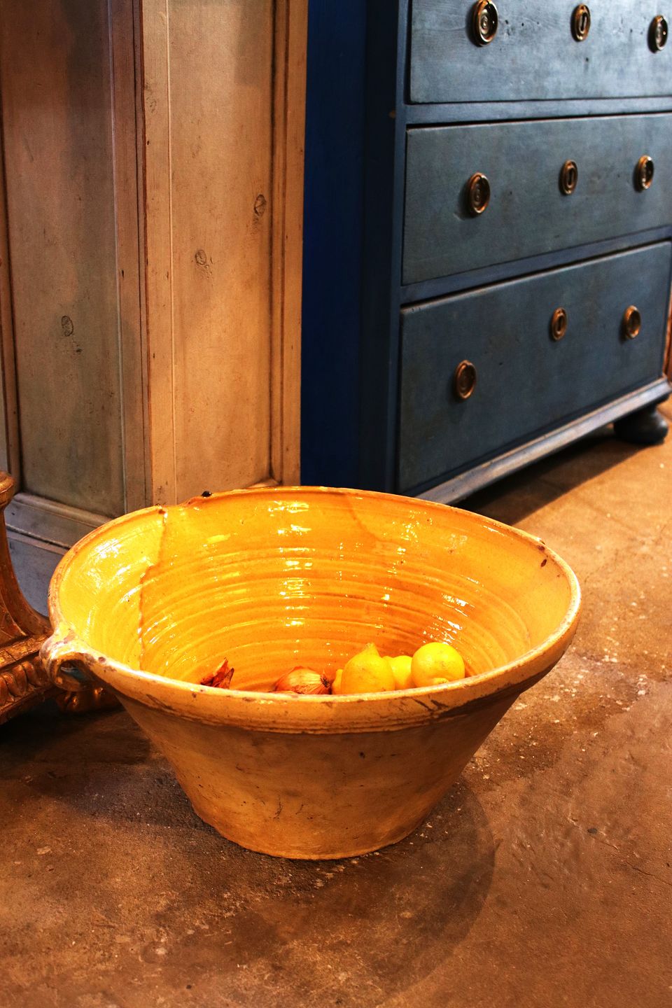 Fadet er håndlavet med håndtag, hældetud, og smuk gule glasur på indersiden. H: 21cm. Dia.: 46cm.