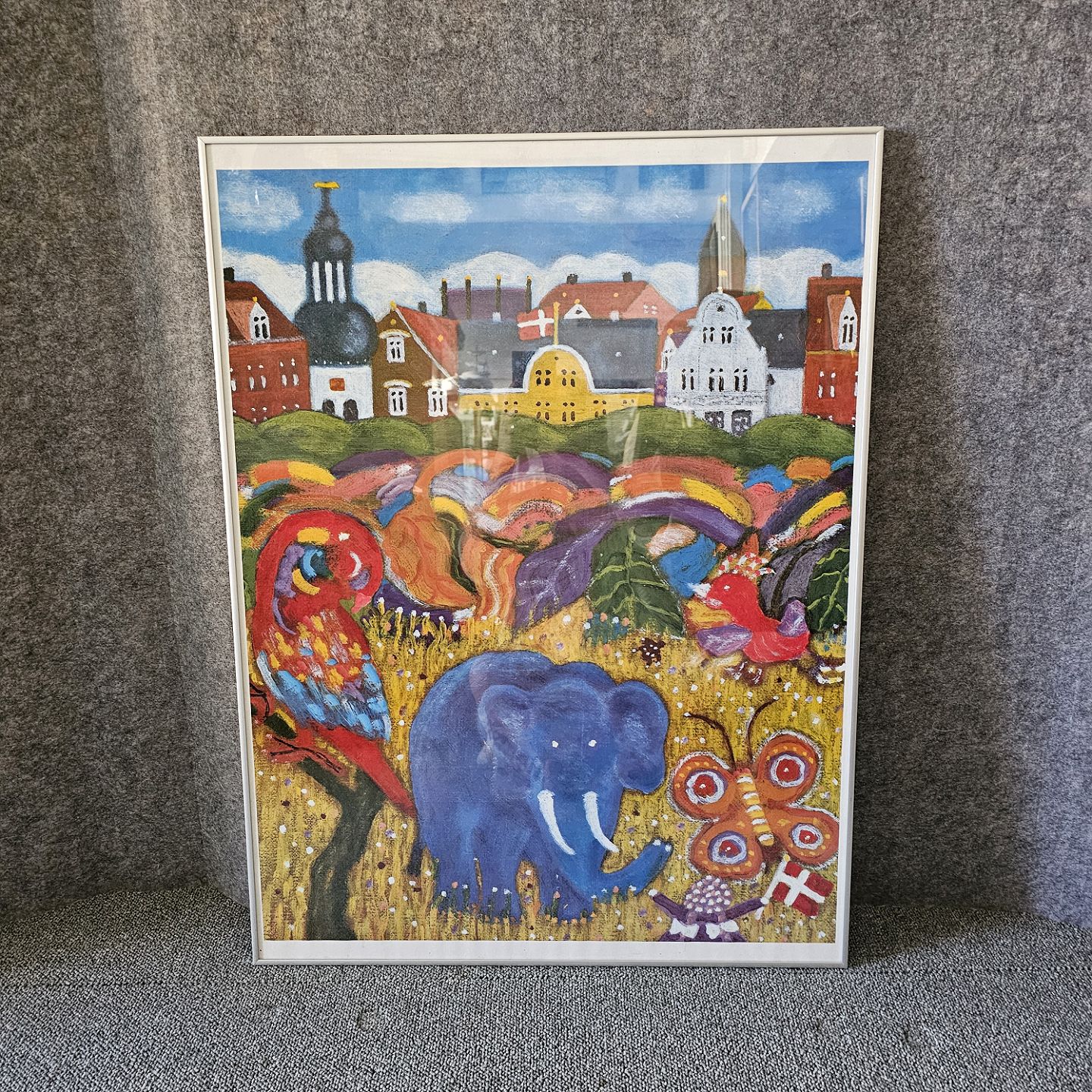 Indrammet tryk i aluminiumsramme med motiv af Aalborg og dyr fra Aalborg zoologisk have