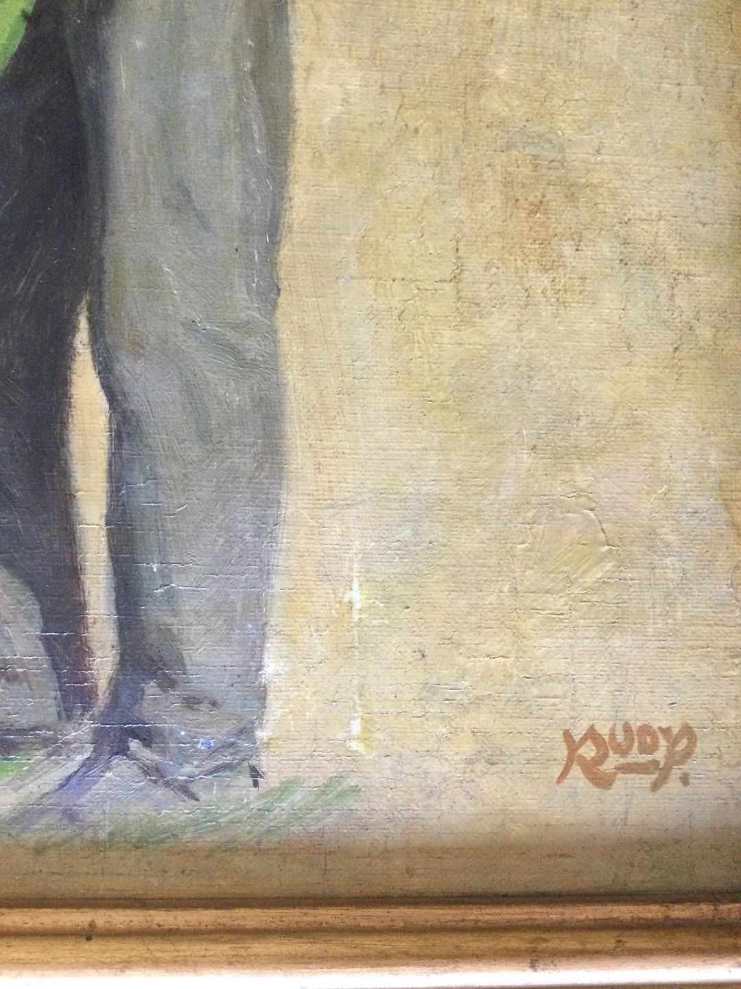Bagpå udstillingsmærkat 1954 "Karl med Mejeredskab" Forarbejde til Høstbillede.