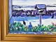 Text available in Danish: Maleri af Th. Hagedorn-Olsen - Udsigt fra vindue med foderbræt, fugle mv.