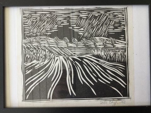 Text available in Danish: Linoleumssnit af Sofie Bagger - Landskab Vendsyssel 1992..