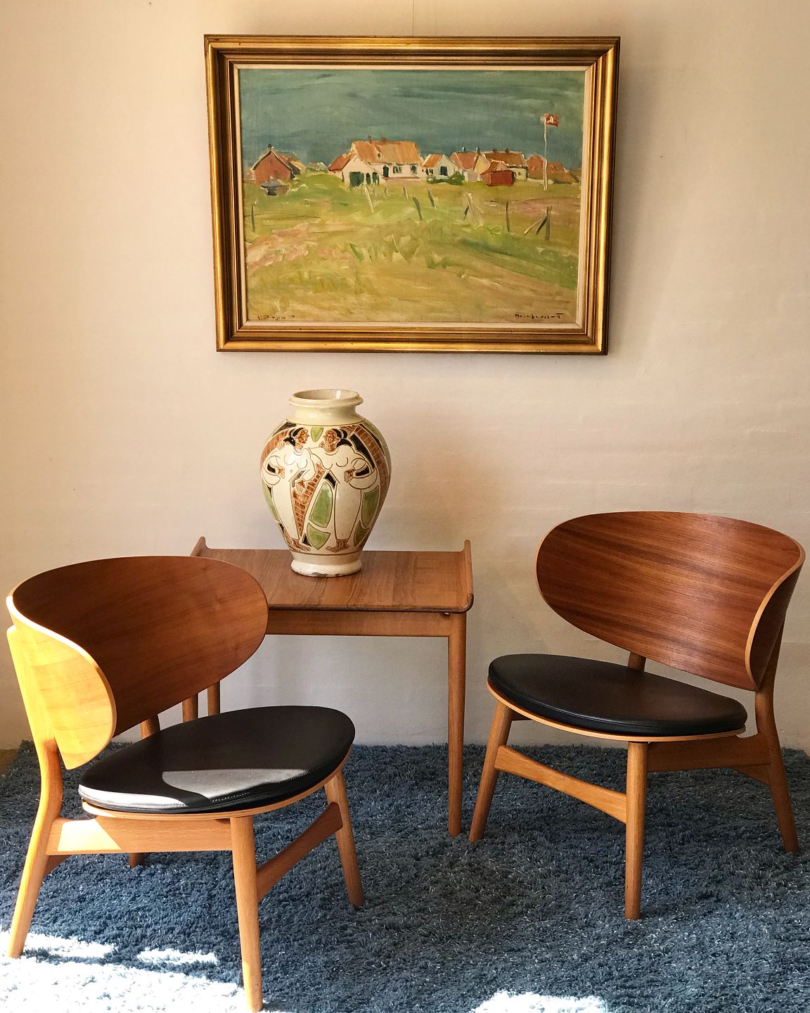 Text available in Danish: Wegner lænestole og bord. Venus sættet. Pæn stand hynder med følger. Valnød og eg.