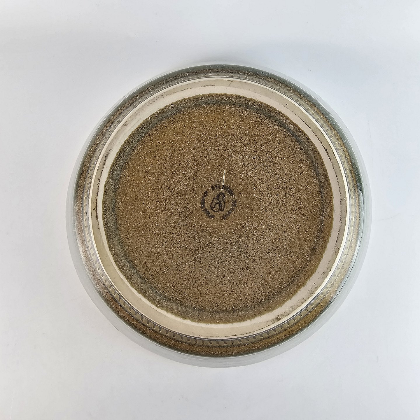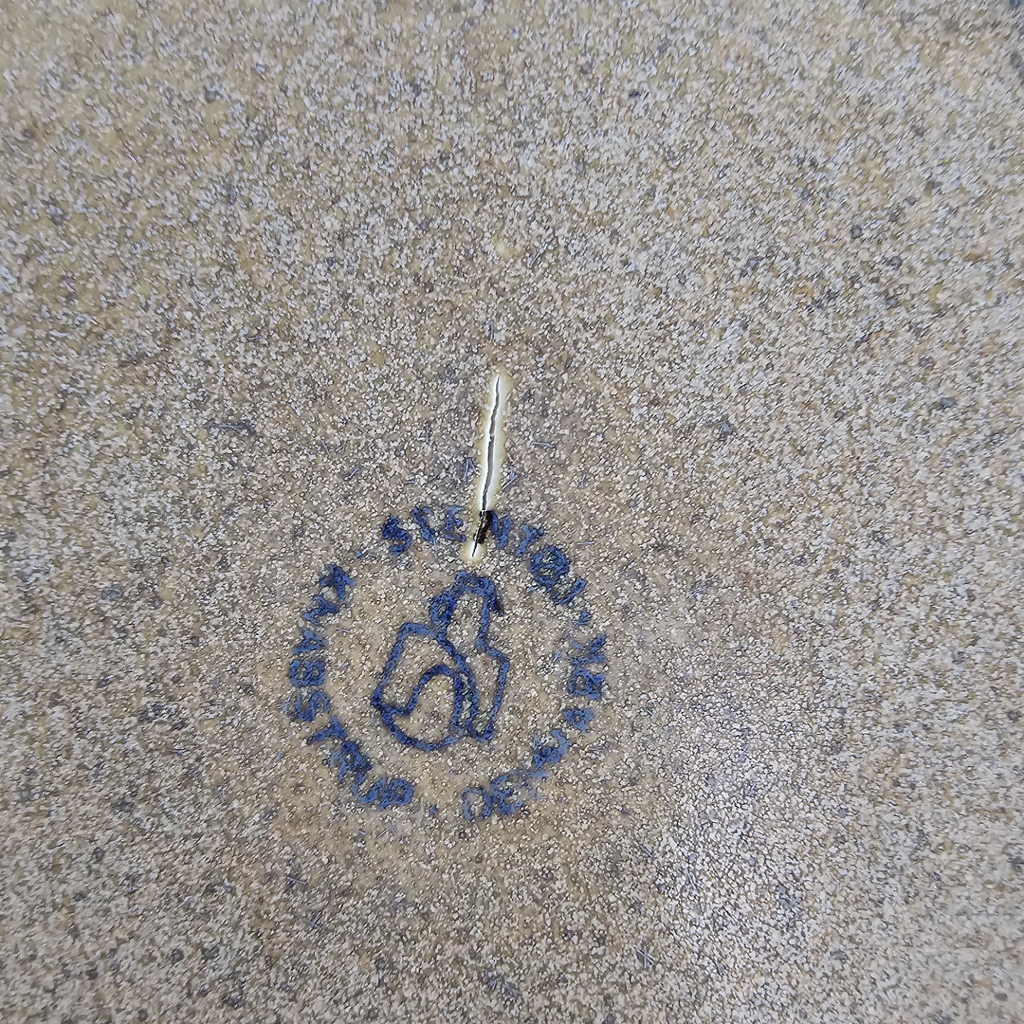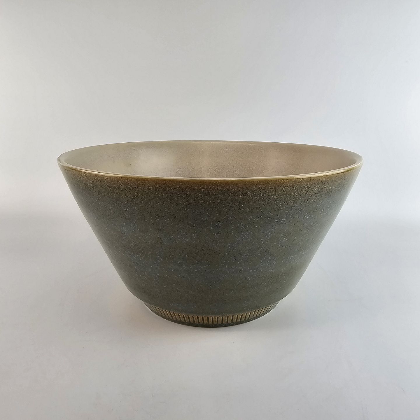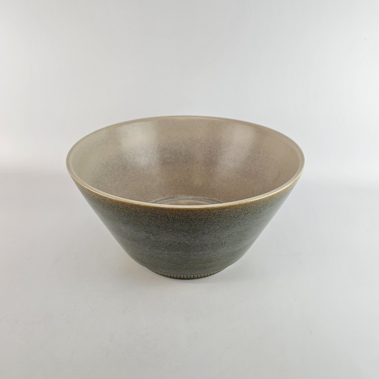 Text available in Danish: Skål af stentøj og dekoreret med en grønlig nuancefarvet glasering.