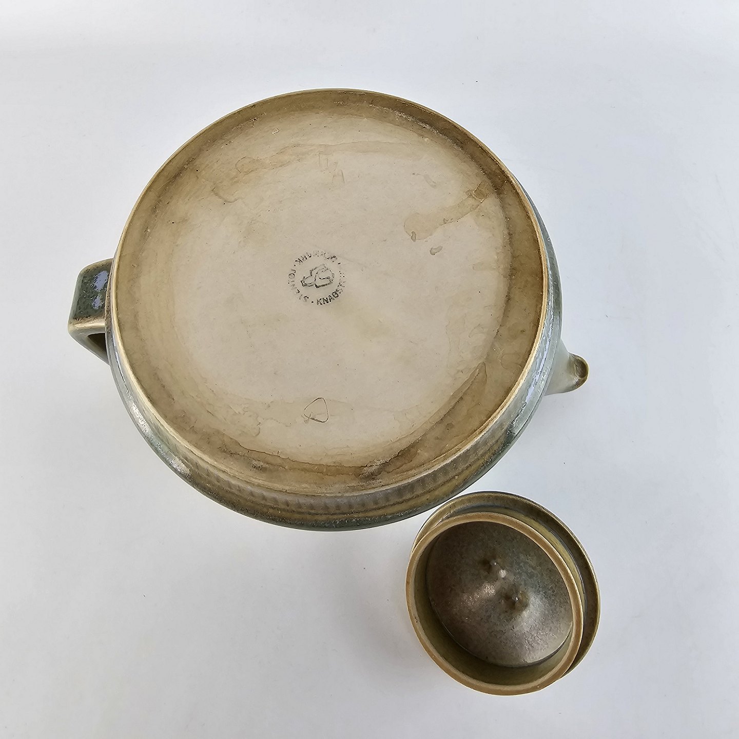 Text available in Danish: Tekande med låg af stentøj og dekoreret med en grønlig nuancefarvet glasering. Fra serien Knabstrup - ofte kaldet Grøn Nøddebo