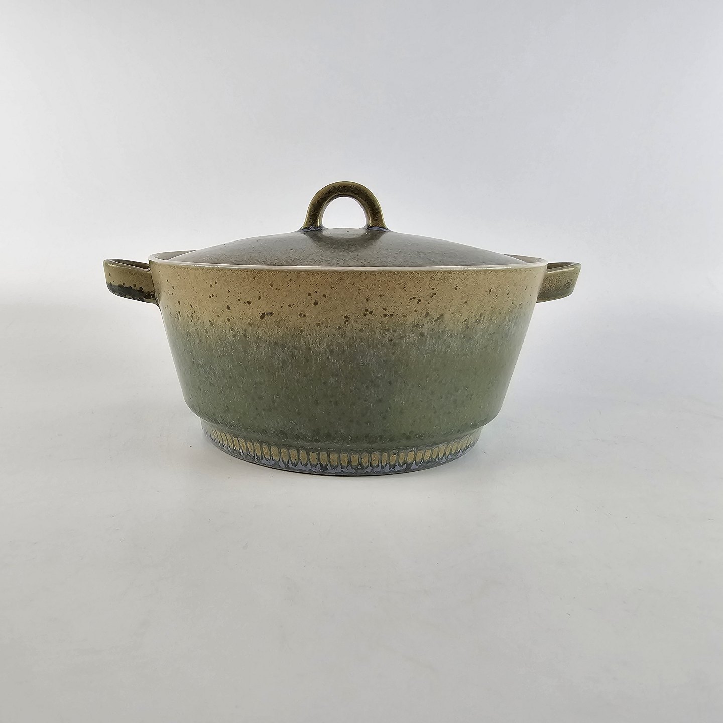 Text available in Danish: Skål med låg af stentøj og dekoreret med en grønlig nuancefarvet glasering.