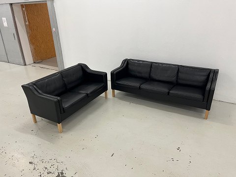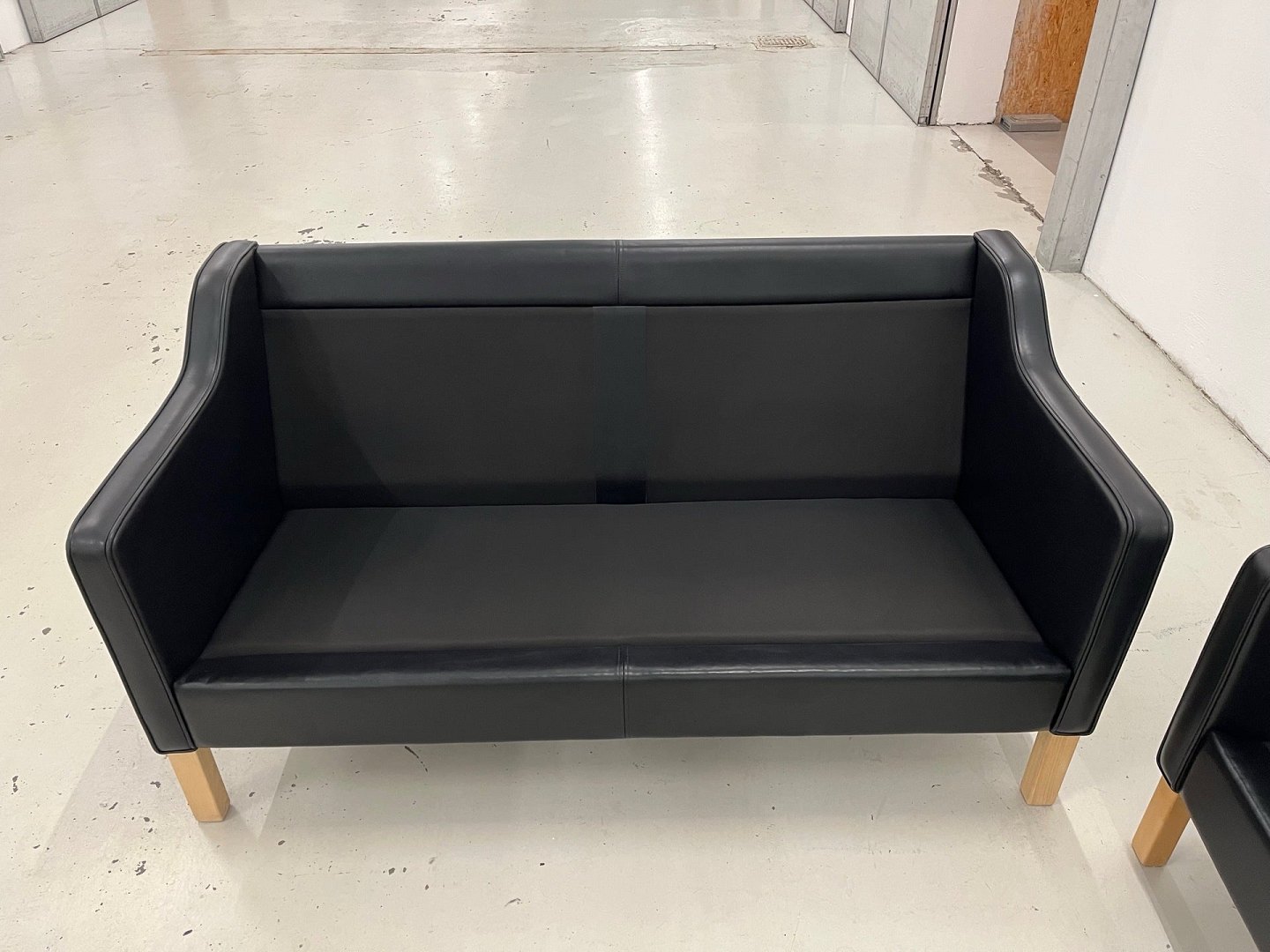 Mogens Hansen MH195 3+2 Pers. Sofa group in black prestige leather and with legs in light beech. New price 73.541,- Seats with down top and back cushions with polydown. The sofas have had 1 owner and are in really nice condition condition, cleaned and leather treated. We also have the reclining chair MH195 that fits the set in stock. DESCRIPTION: MH195 was developed with the aim of creating a complete piece of furniture. t consisting of both sofa, high recliner, low chair and footstool. The model thus provided the opportunity to create a harmonious and stylish overall living room adapted precisely to the customer's needs and wishes. With its distinctive appearance, which is emphasized by welt stitching on the frame and cushions, the model soon attracted wide interest, and MH195 is still today one of Mogens Hansen's best-selling models.Measures 3 pers.Length 210 cm.Width 80 cm.Seat depth 55 cm.Seat height 46 cm.Measures 2 Pers.Length 150 cm. Width 80 cm. Seat depth 55 cm. Seat height 46 cm.