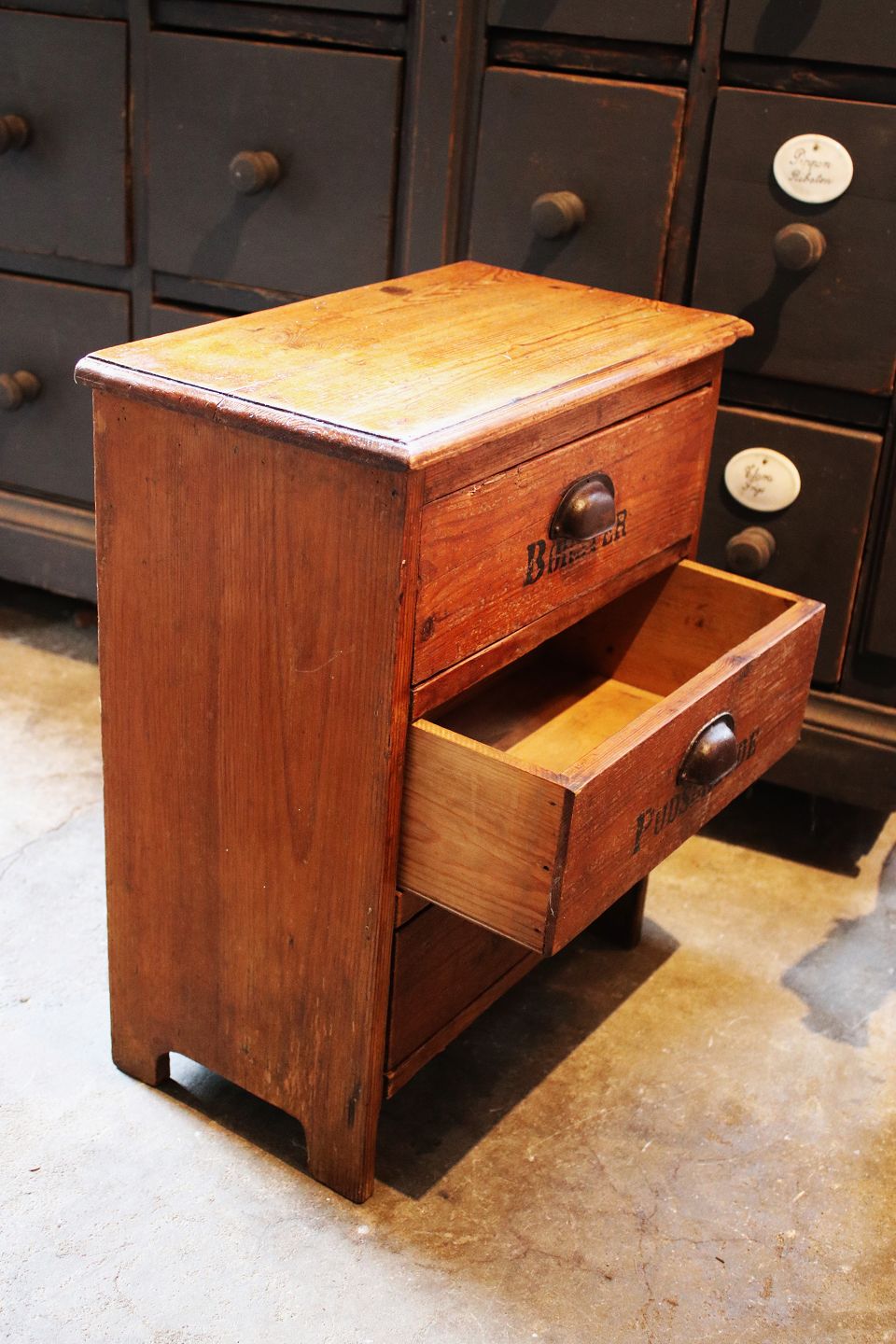Nice little mini chest of drawers in wood from around 1900 with 3 drawers (with painted writing: Brushes, cleaning cloths & tools),