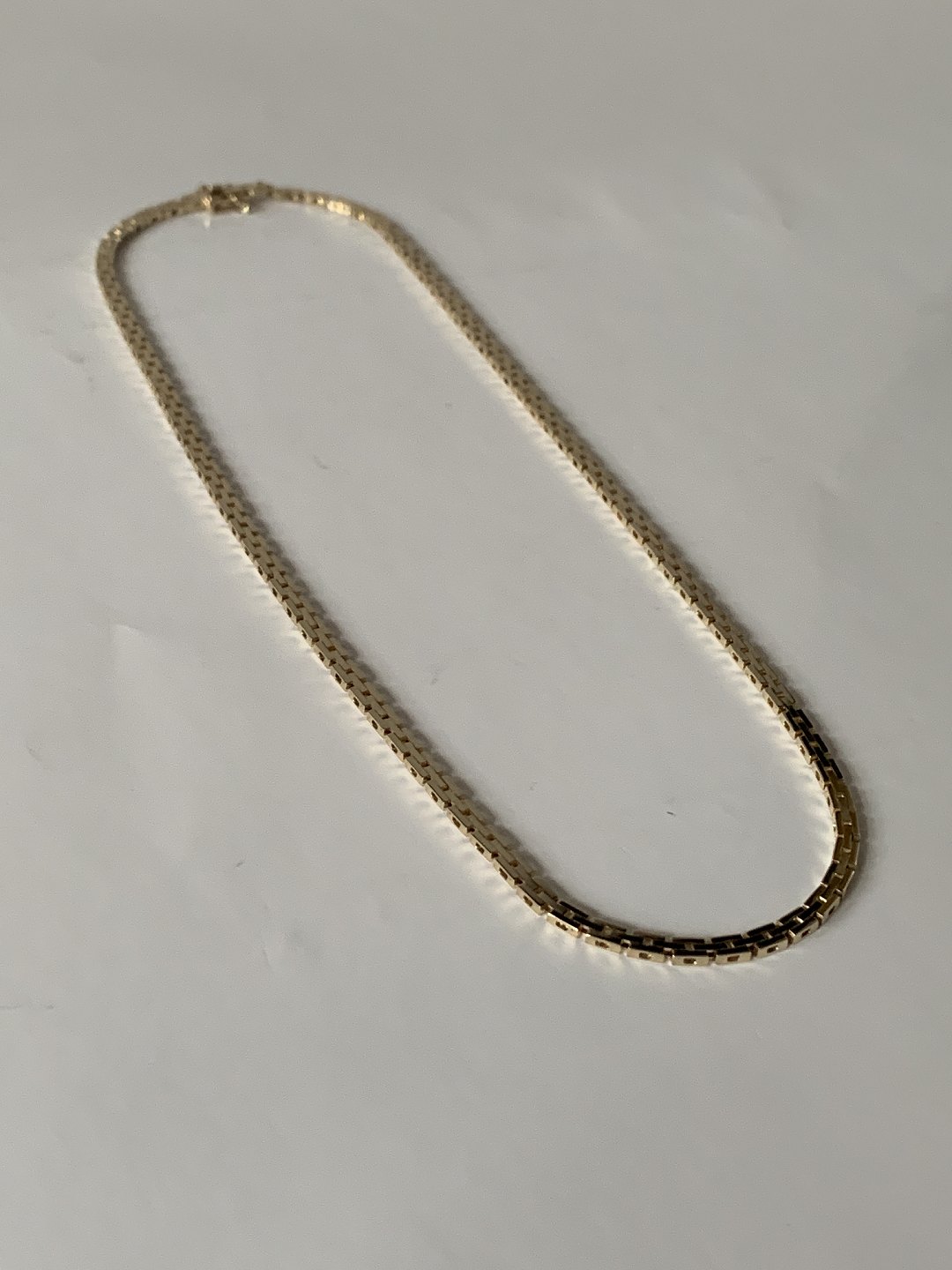 Classic necklace in brick motif, 3 rows and with box lock. The brick motif is elegant and timeless, and can therefore be used for almost any type of clothing. In addition to being a beautiful necklace, a gold chain is also a good gold investment - both in the short and long term.