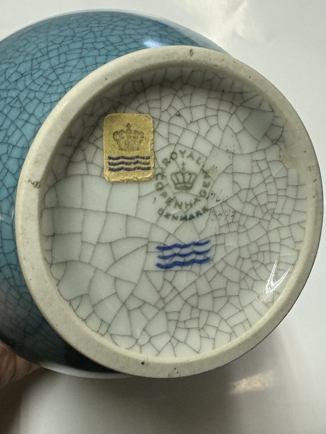 Porcelain vase from Royal Cooenhagen with blue crackle decoration. Appears in good condition. No damage or repairs. The factory mark on the bottom. Factory frist produktion. H. 25 cm