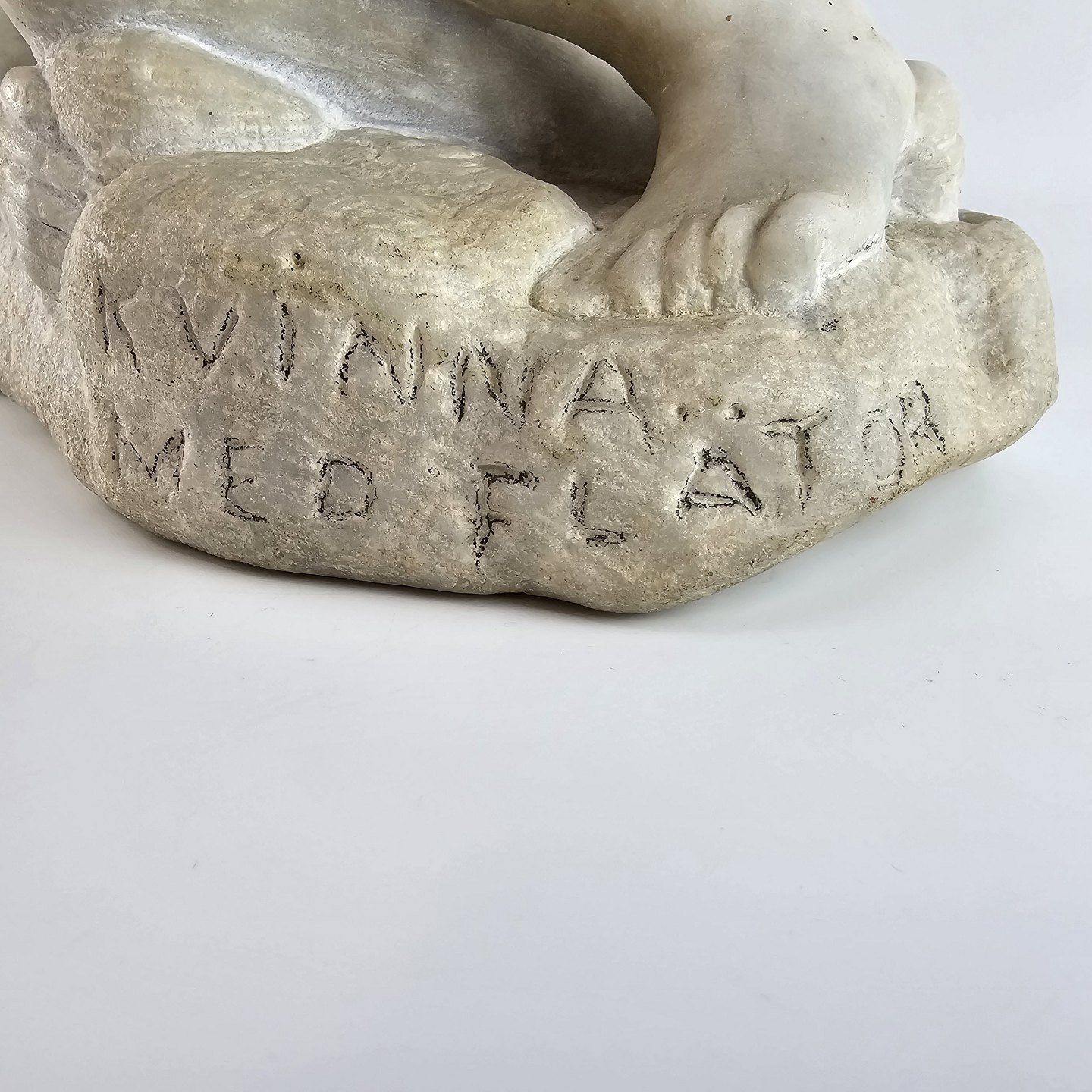 Svensk skulptur i massiv marmor med motiv af liggende kvinde med lange fletninger. Titlen Kvinna med flator