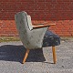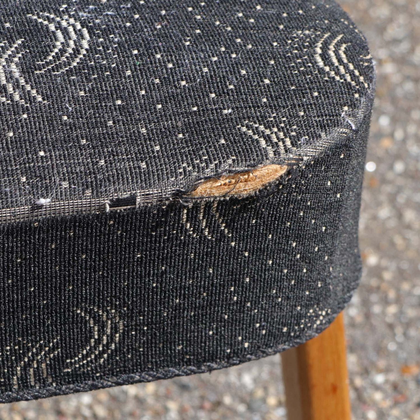 Fremstår med slidt og rift i betrækket samt brugsspor på træet.