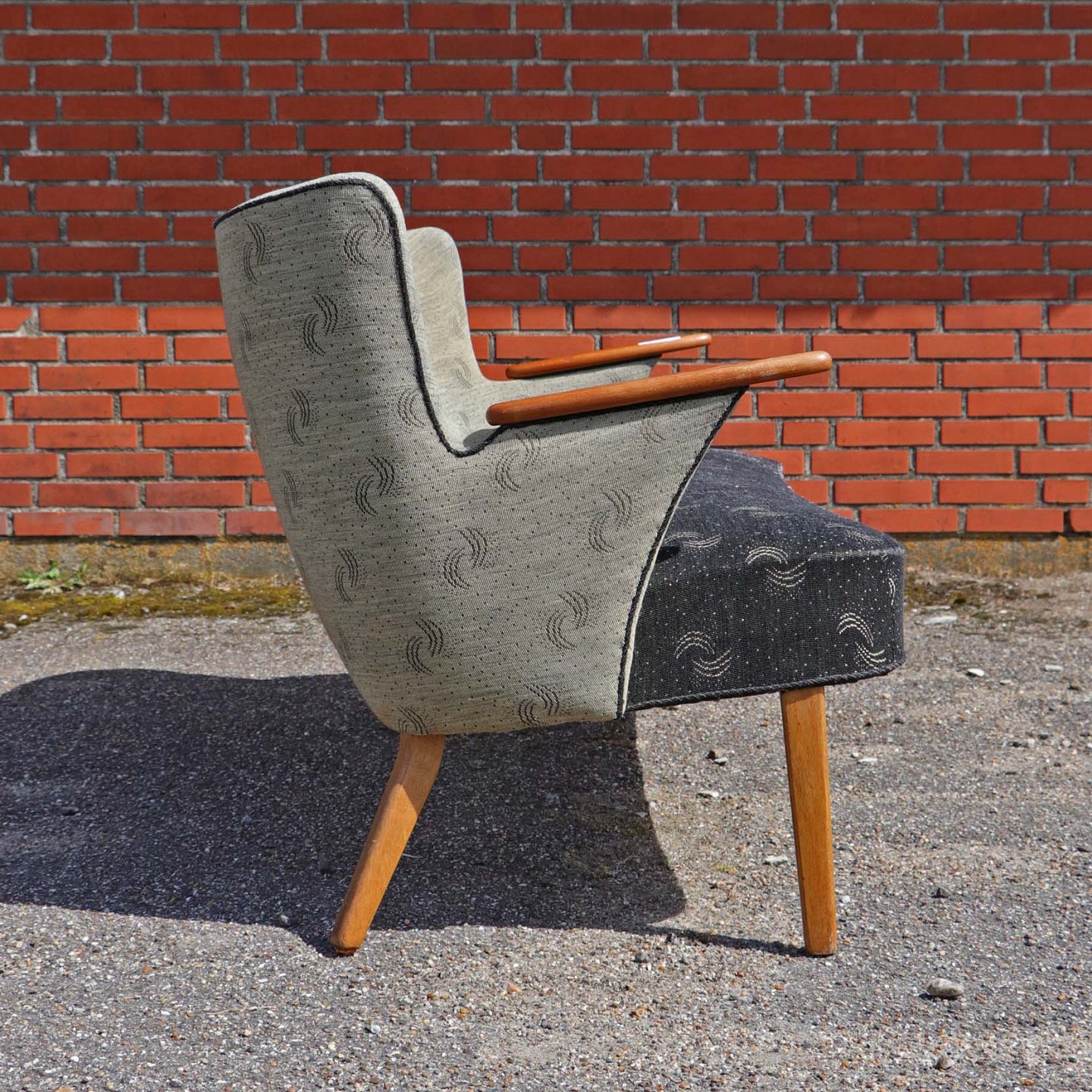 Tre personers sofa betrukket med struktureret lysegrå og koksgrå stof samt med armlæn og ben i lakeret teaktræ. Sofaen trænger til ombetrækning.