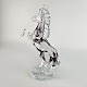 Mundblæst glasfigur formet som en stejlende hest. Det er lavet som fusk, foden er en genbrugt flaskebund, hvor der står Copenhagen