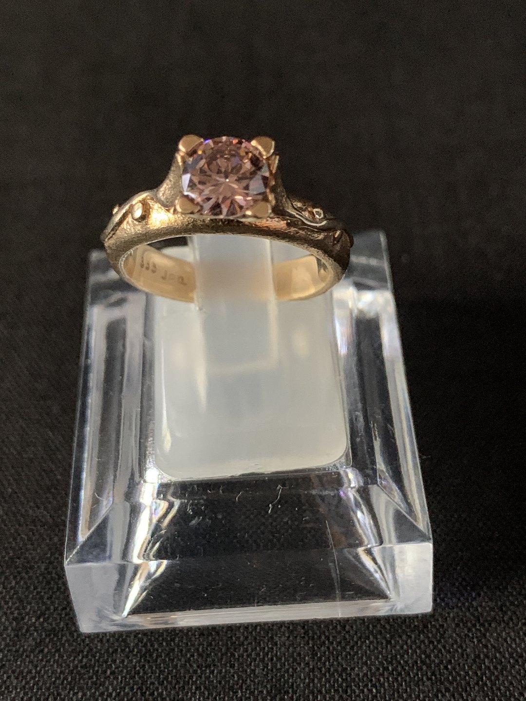 Smuk og tidløs damering i 8 karat guld med indlagt lyserød sten. i størrelse 50. Ringen har en flot struktur, og kan let kombineres med andre ringe. På grund af ringens flotte tidløse mønster, kan ringen bæres af kvinder i alle aldre. Ringen er stemplet 333 JAa.