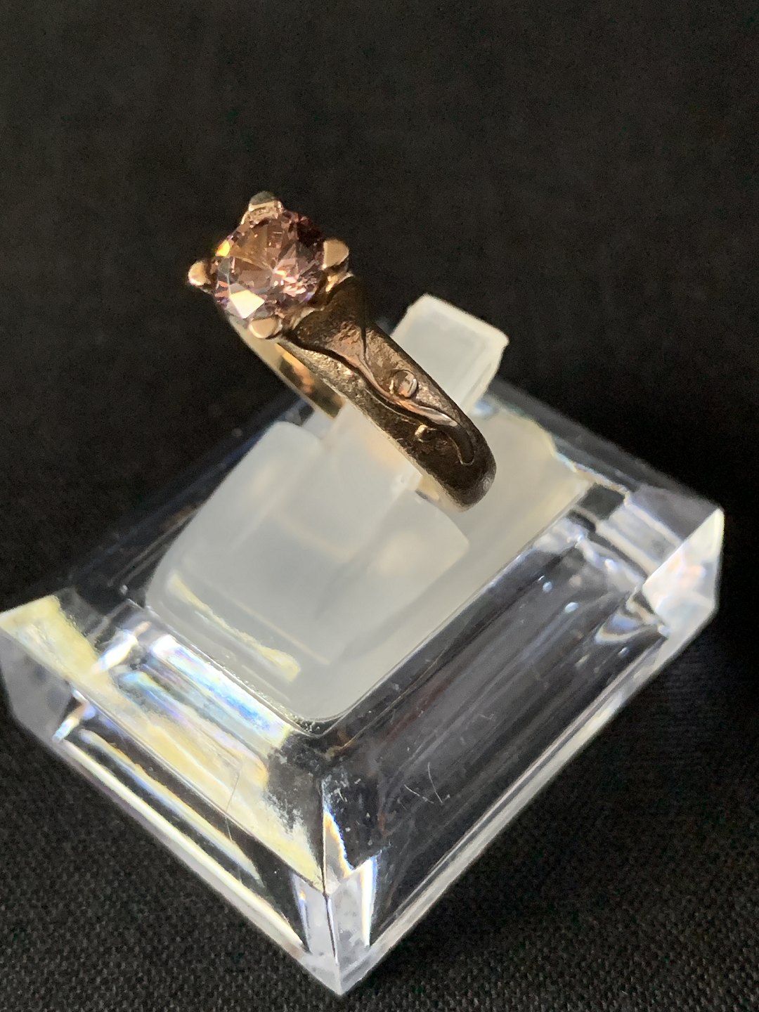 Smuk og elegant damering i 8 karat guld, med indlagt lyserød sten. Størrelse 50