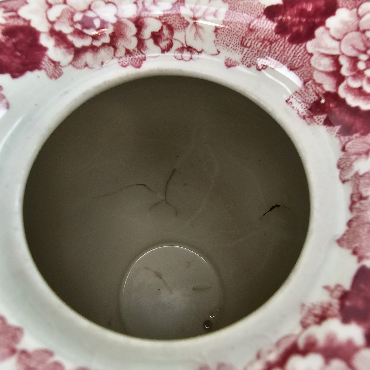 Rød Paris er af engelsk fajance dekoreret med forskellige landskaber og blomster i kanten, alt i forskellige røde nuancer