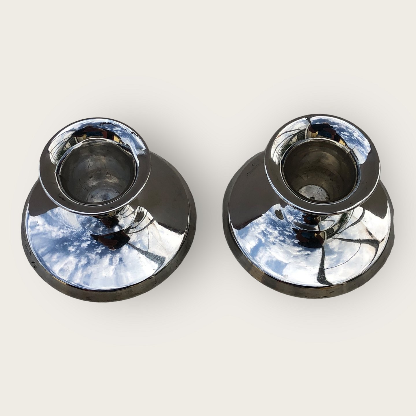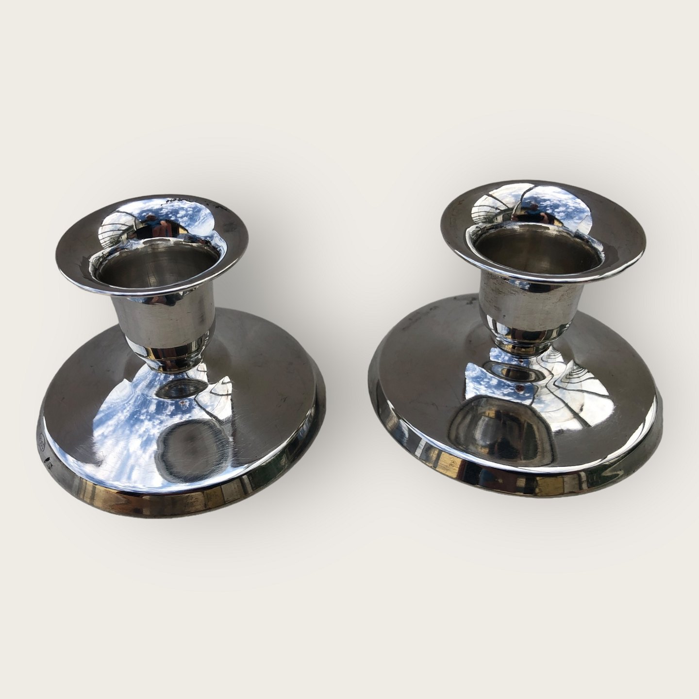 2 små moderne sølvstager, stemplet I/S Ricmond 830S, Lille bule øverst på stage (se foto) ellers pæn brugt stand. Højde 5 cm, diameter 7 cm.