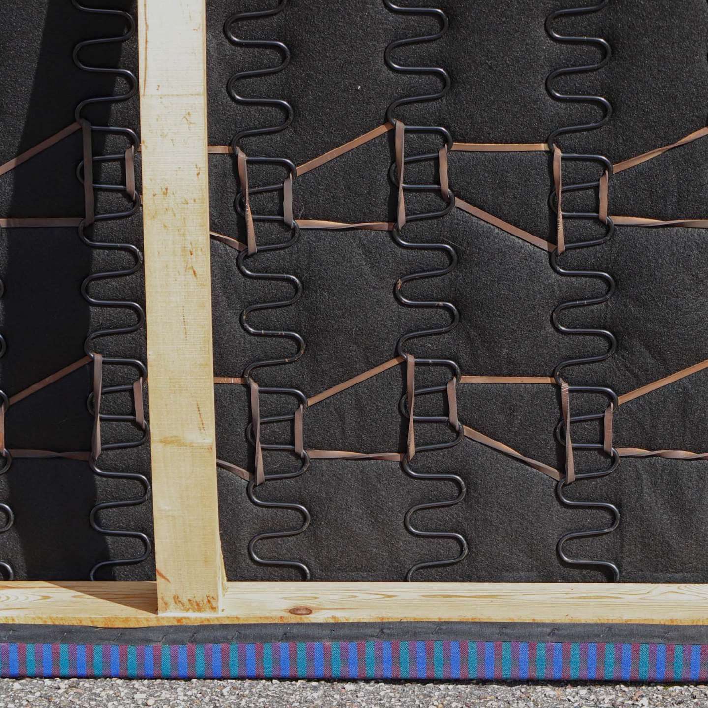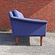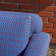 Tre personers sofa med stel i lakeret teaktræ. Sofaen er betrukket med et multifarvet glat stof og ekstra stof medfølger.