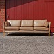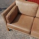 Text available in Danish: Patineret tre personers sofa i bøffellæder med ben i lyst lakeret træ
