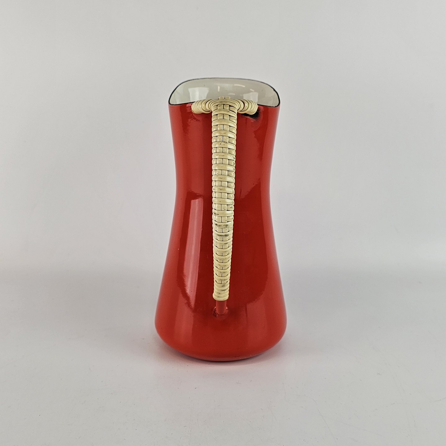 Rød emaljekande med hvid emaljebelægning på indersiden samt hank omviklet af flettet plast
