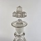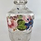 Text available in Danish: Mundblæst karaffel af glas, dekoreret med emaljemalede frise indeholdende roser, blade og forskellige blomster. Revne i nederste del.