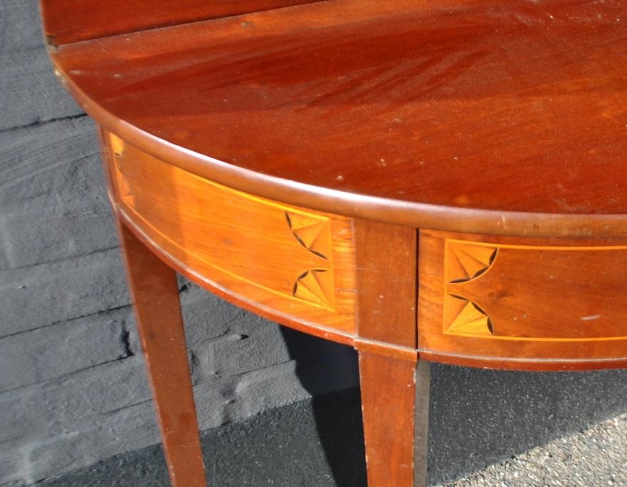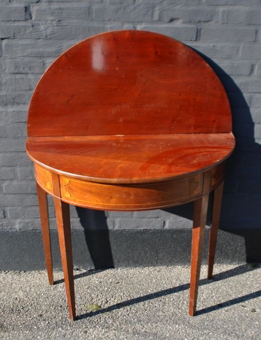 Danish empire demi lune game table in mahogany with intarsia. approx. 1810. H.: 78 cm. D.: 44 cm. W.: 88 cm. Unrestored!