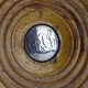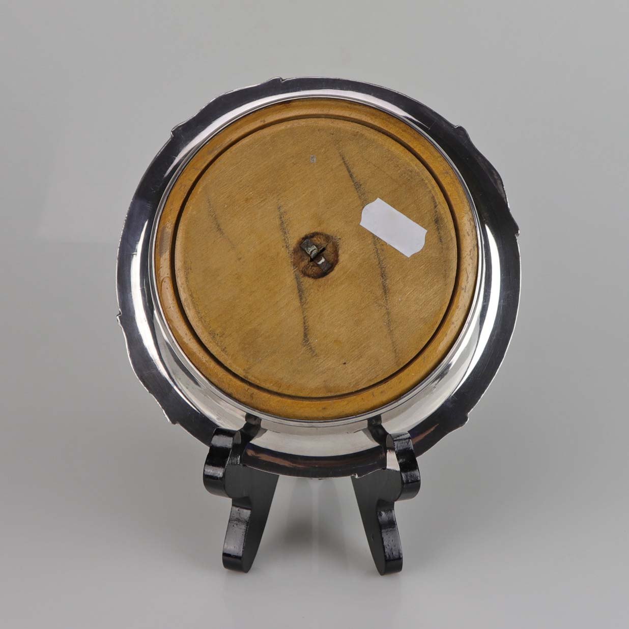 Text available in Danish: Vinbakke i pletsølv med bund af lyst træ. Bakken er dekoreret med blomster langs kanten. Indgraveret med monogrammet RU i bunden og ved fod står der 12.12.06 4651