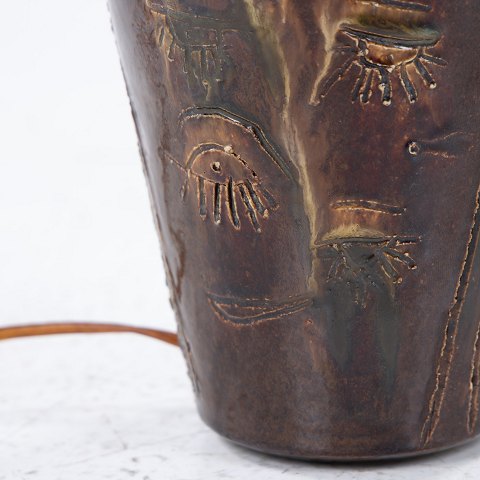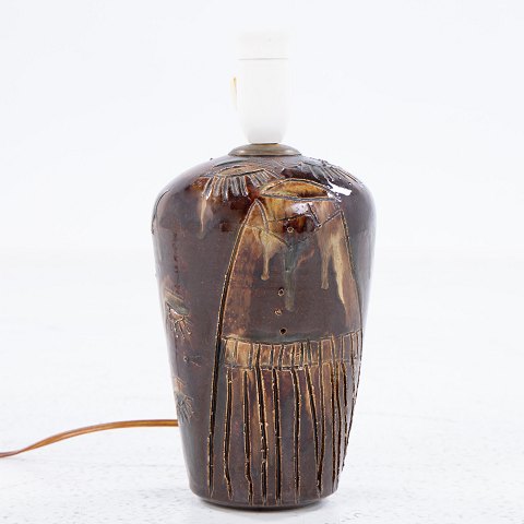 Bordlampe i stentøj m. dekorationer i brun glasur.