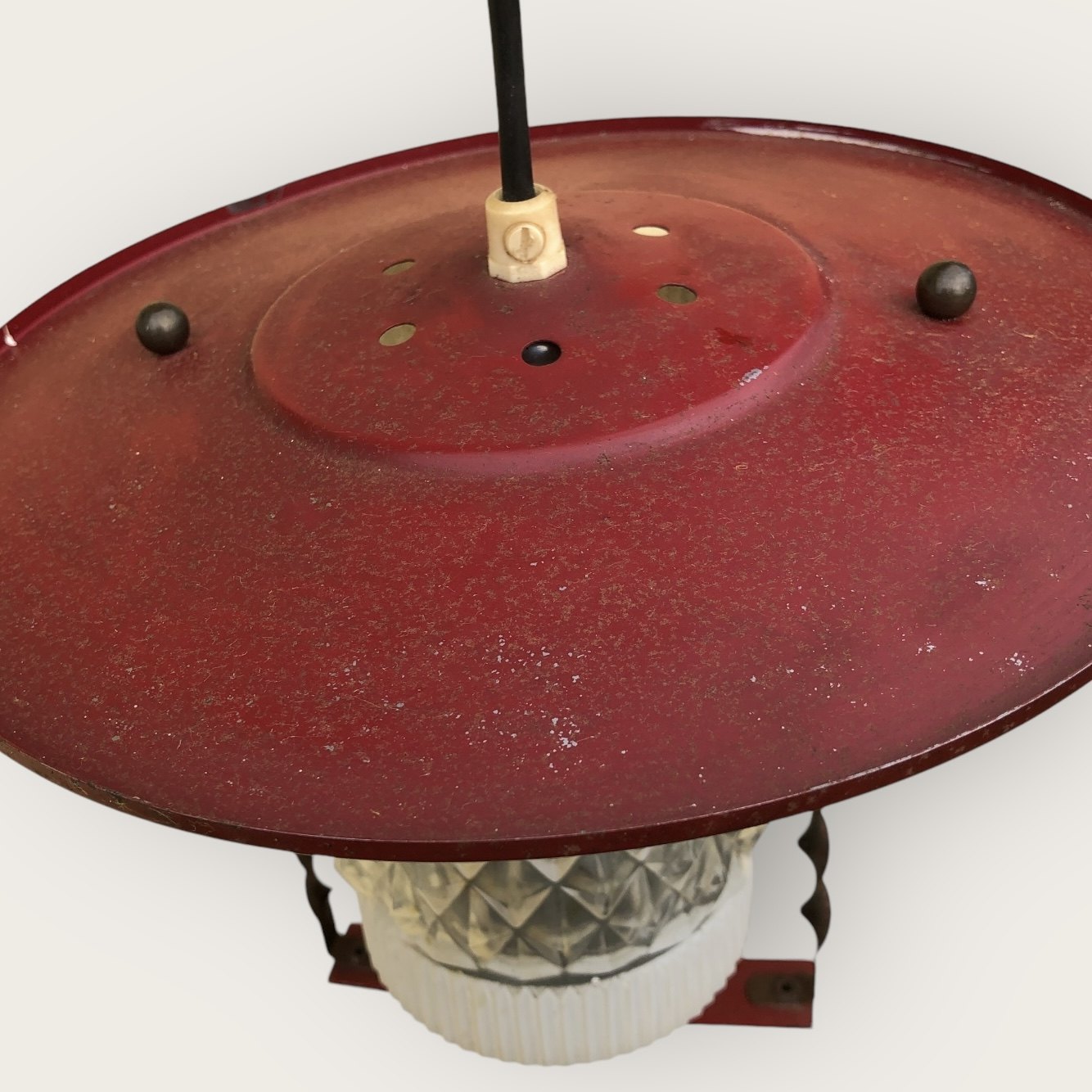 Older ceiling lamp in red painted metal and glass, appears with patination (see photo). Height approx. 20 cm
