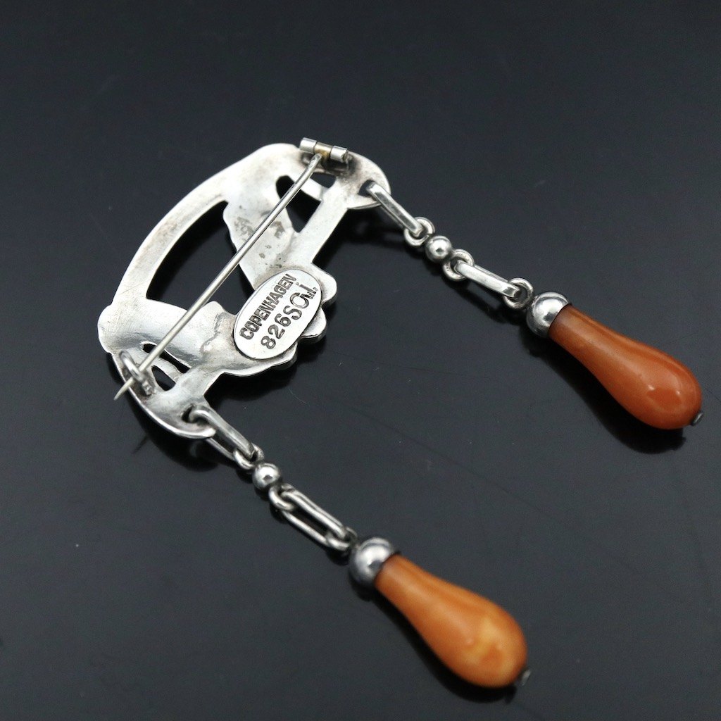 Georg Jensen. 826s Silver Brooch with Agates and Amber. 1907-14 Hallmarks.