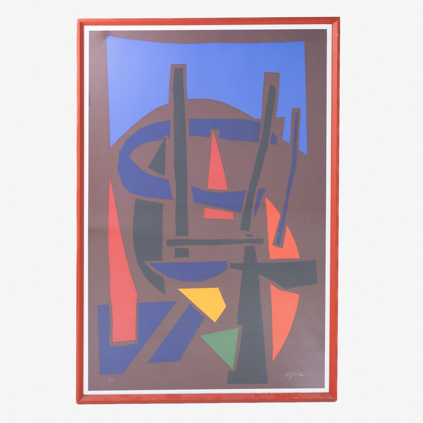Signed silk print in red frame. 8/10.