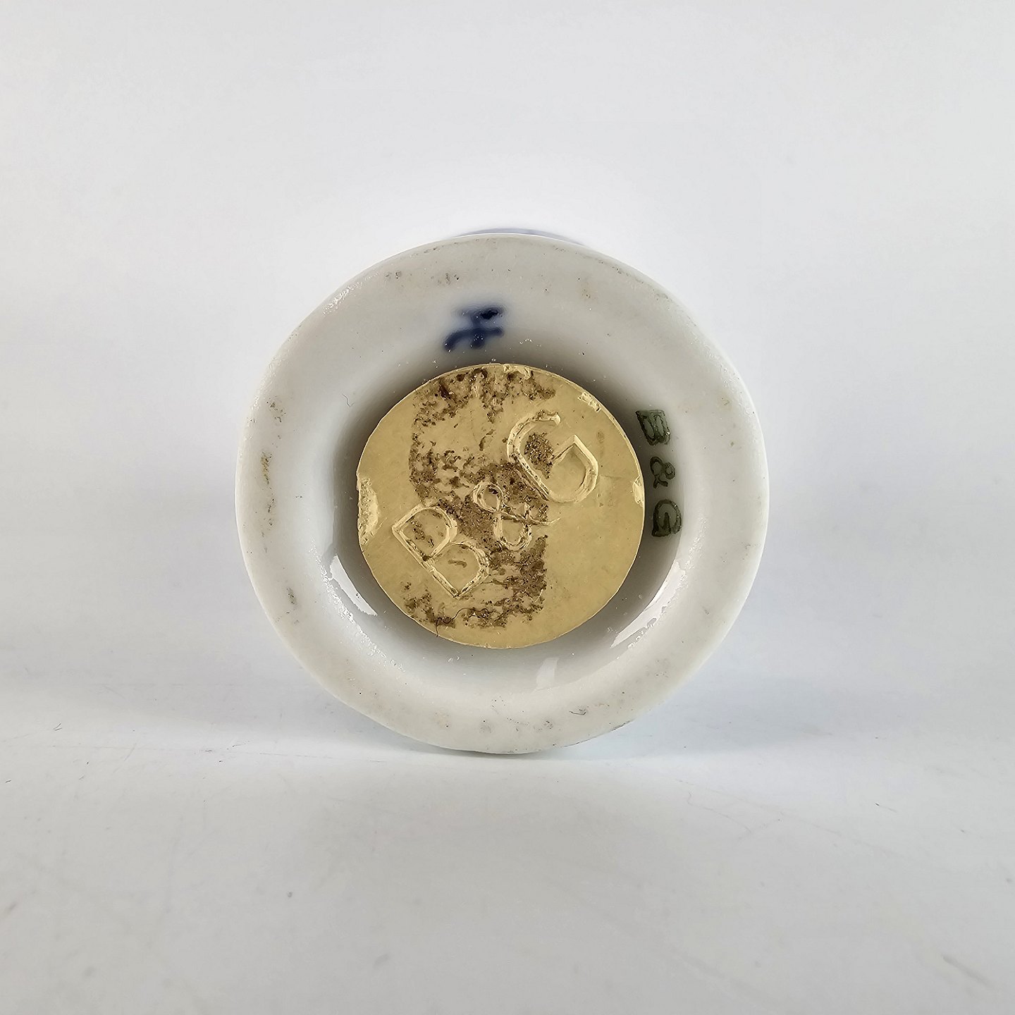 Saltbøsse i hvidt porcelæn med skelform og motiv af guirlander med blå blomster.