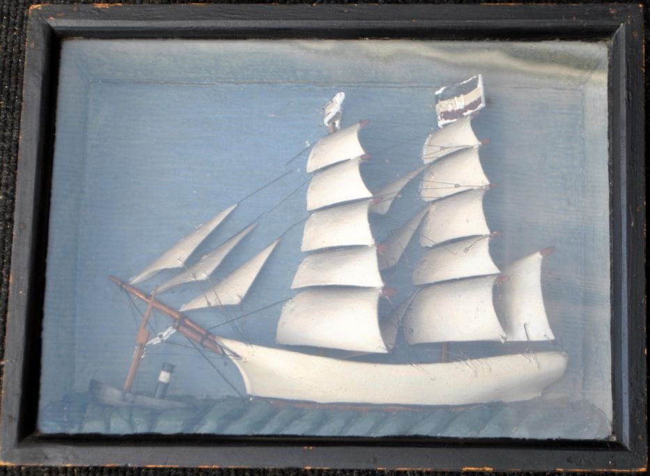 Halv skib, 19. årh. Tyskland. To mastet skonnert, der fører tysk flag. Foran bugserbåd. 28 x 38 cm. D.: 10 cm. I mørkbemalet trææske.