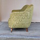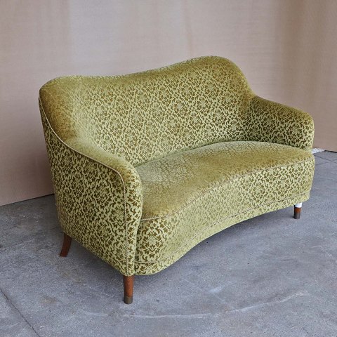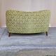 Ældre to personers personers sofa med springfjeder sæde. Sofaen er betrukket med mønstret grønt velour stof og med ben af mørkt lakeret træ.
