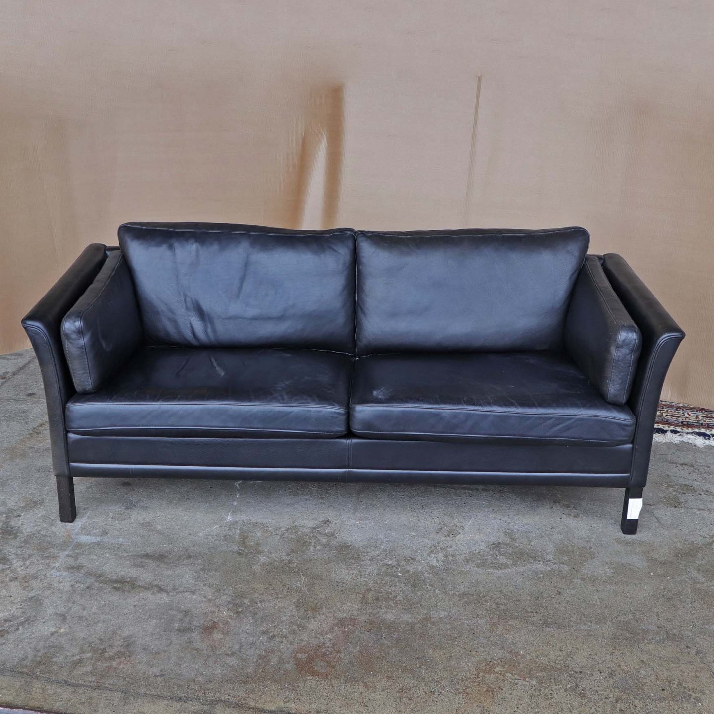 Text available in Danish: Tre personers sofa betrukket med sort bøffellæder og ben i mørkt træ