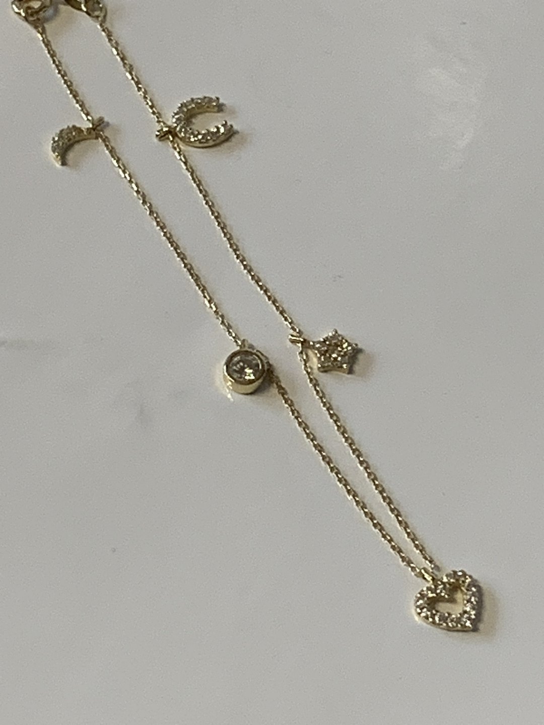 Sødt og feminint guldarmbånd i 14 karat guld, med smukke vedhæng bl.a. hjerte og hestesko. Armbåndet er tyndt, og ligger blødt om håndleddet. De små vedhæng giver armbåndet liv og dynamik. Ideel gave ide til den unge pige.