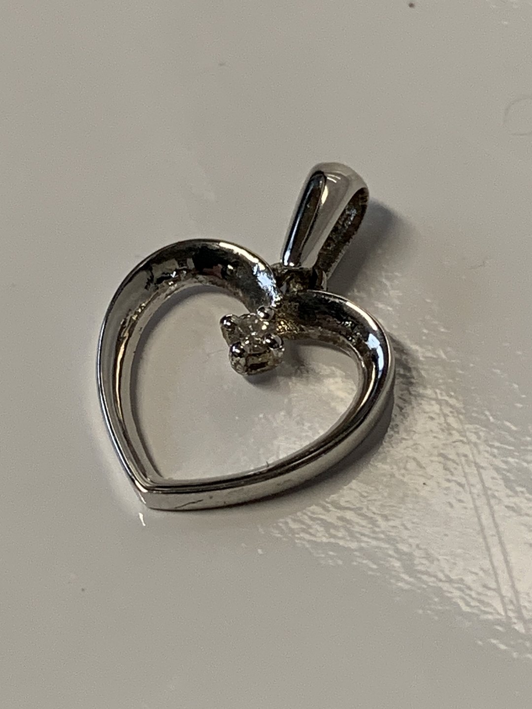 Nice and discreet pendant, shaped like a heart with a diamond in 14 carat white gold. Suitable for a necklace or as a pendant in a bracelet. Beautiful minimalistic and classic piece of jewelry that has been used for many years.