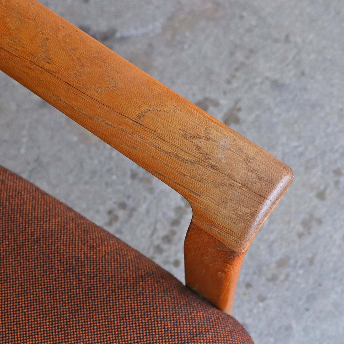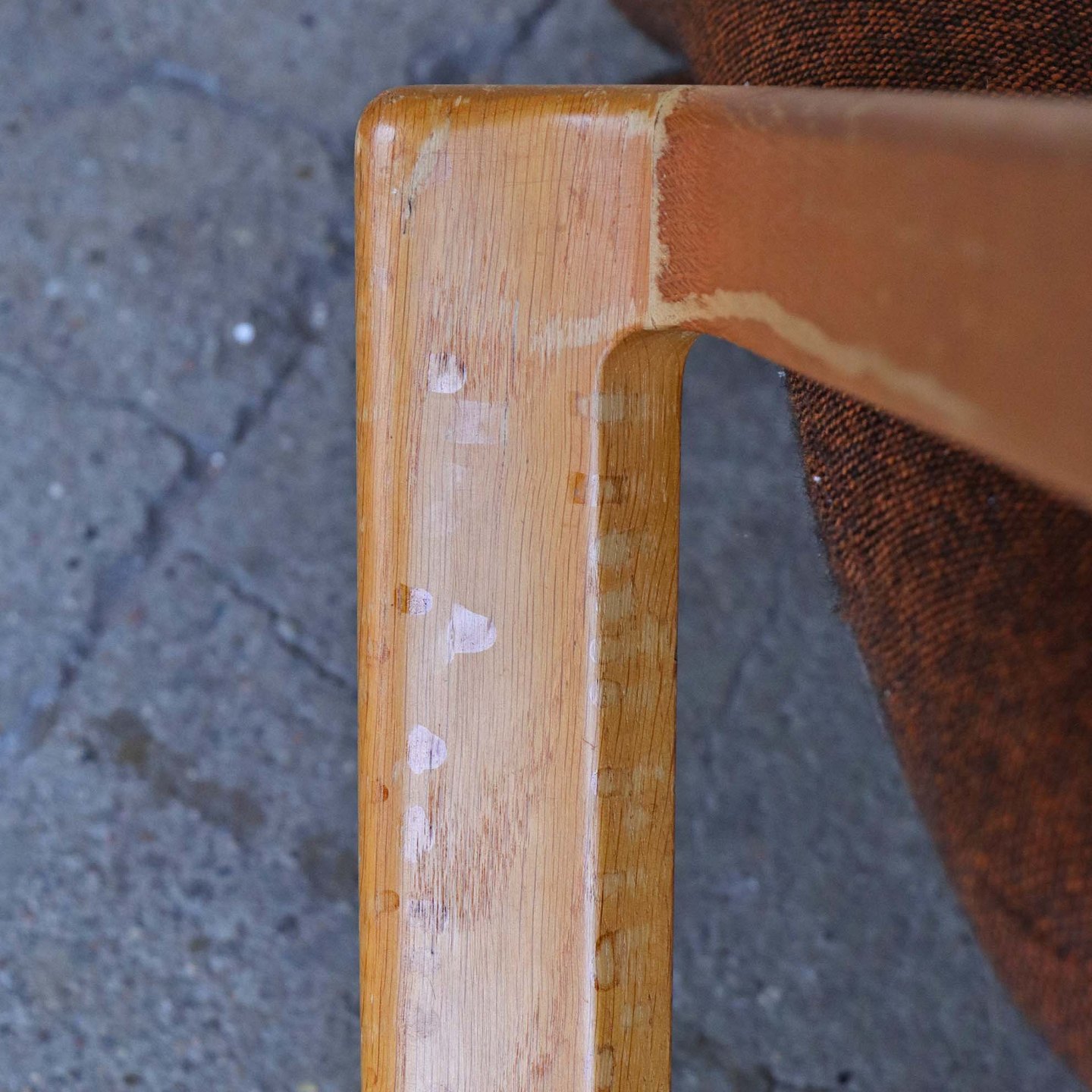 Text available in Danish: Højrygget armstol med polstret ryg og sæde samt nakkepude. Stolen er betrukket med brun meleret uldstof og stellet er i lakeret egetræ