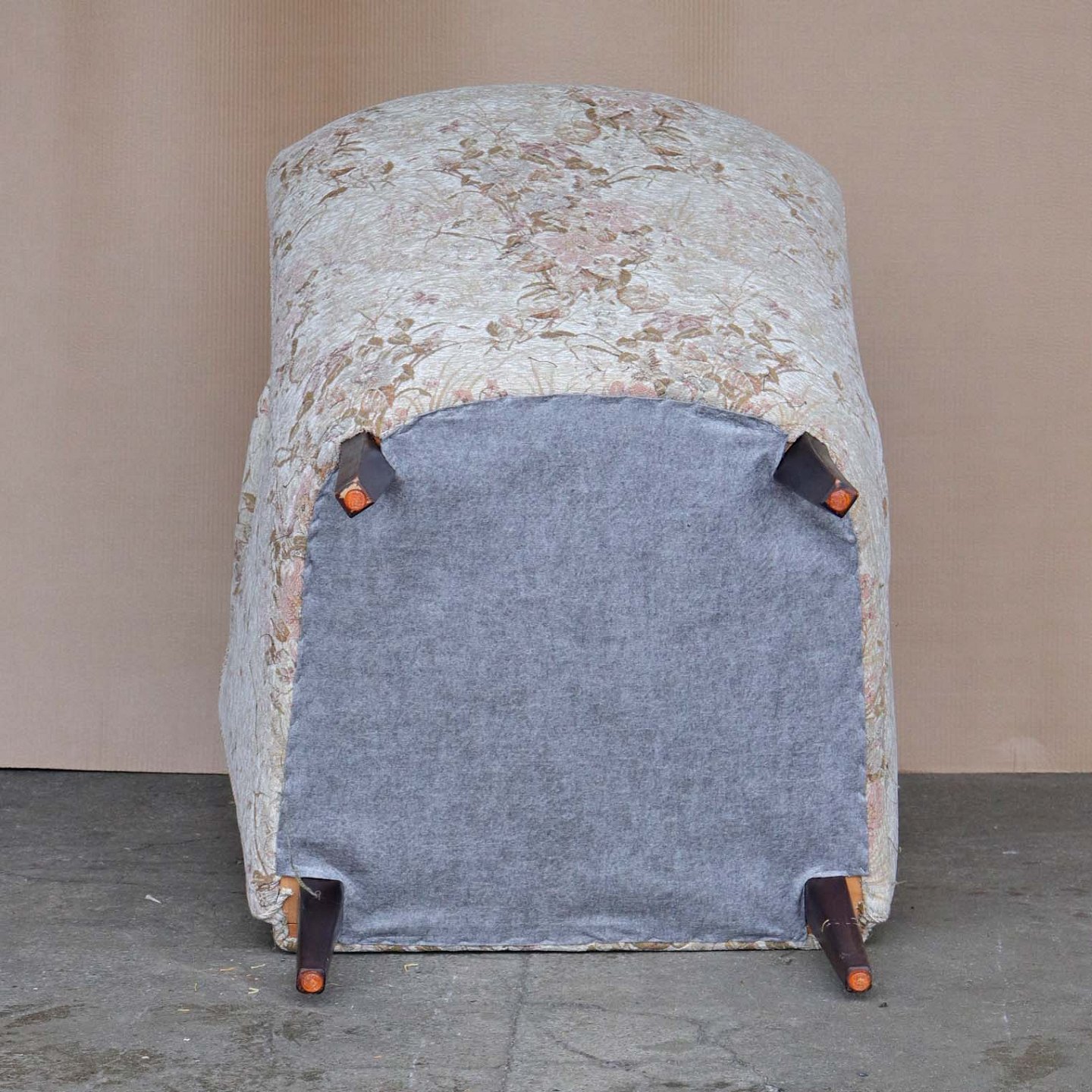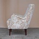 Text available in Danish: Ældre lænestol med springfjeder sæde betrukket med lyst mønstret stof. Stolen har firkantet tilspidset ben i mørk lakeret træ