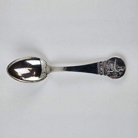 Børne ske i 830 sølv med motiv af kvindelig engel som knæler med en kurv i hænderne.