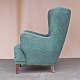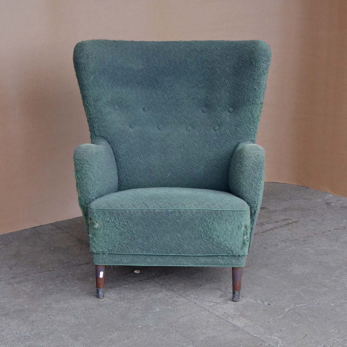 Text available in Danish: Overpolstret lænestol med springfjeder sæde og stel i mørk lakeret træ. Stolen betrukket med grønt struktureret stof