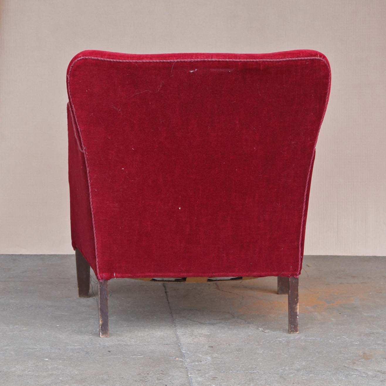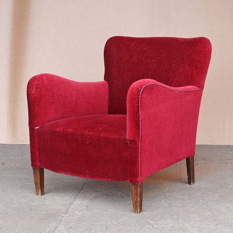 Text available in Danish: Ældre polstret lænestol med springfjeder sæde. Stolen er betrukket med rødt velour stof